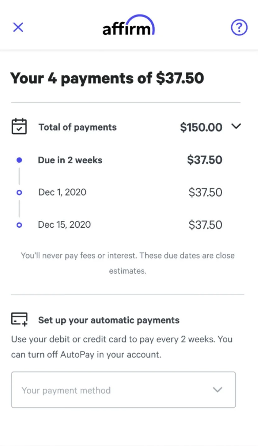 When you buy with Affirm, you always know exactly what you’ll owe and when you’ll be done paying. You’ll never pay a hidden fee.